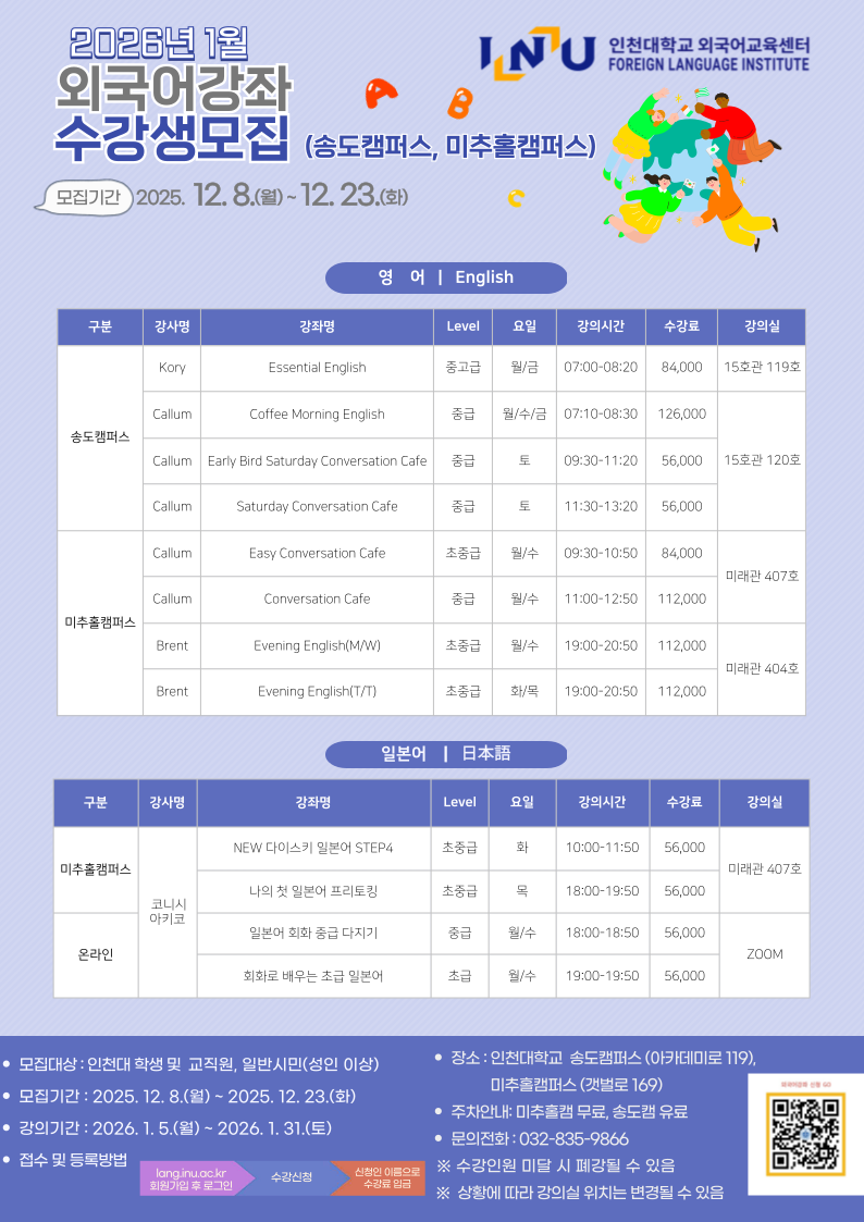 fnctId=bbs,fnctNo=2611 [외국어교육센터] 2026년 1월 외국어강좌 수강생 모집(송도캠퍼스, 미추홀캠퍼스) 글번호 416748 작성일 2025-12-22 수정일 2025-12-22 작성자 국제지원과 (032-835-9866) 조회수 164 *문의: 인천대학교 외국어교육센터 (032-835-9866) 첨부파일 첨부파일이(가) 없습니다. 목록